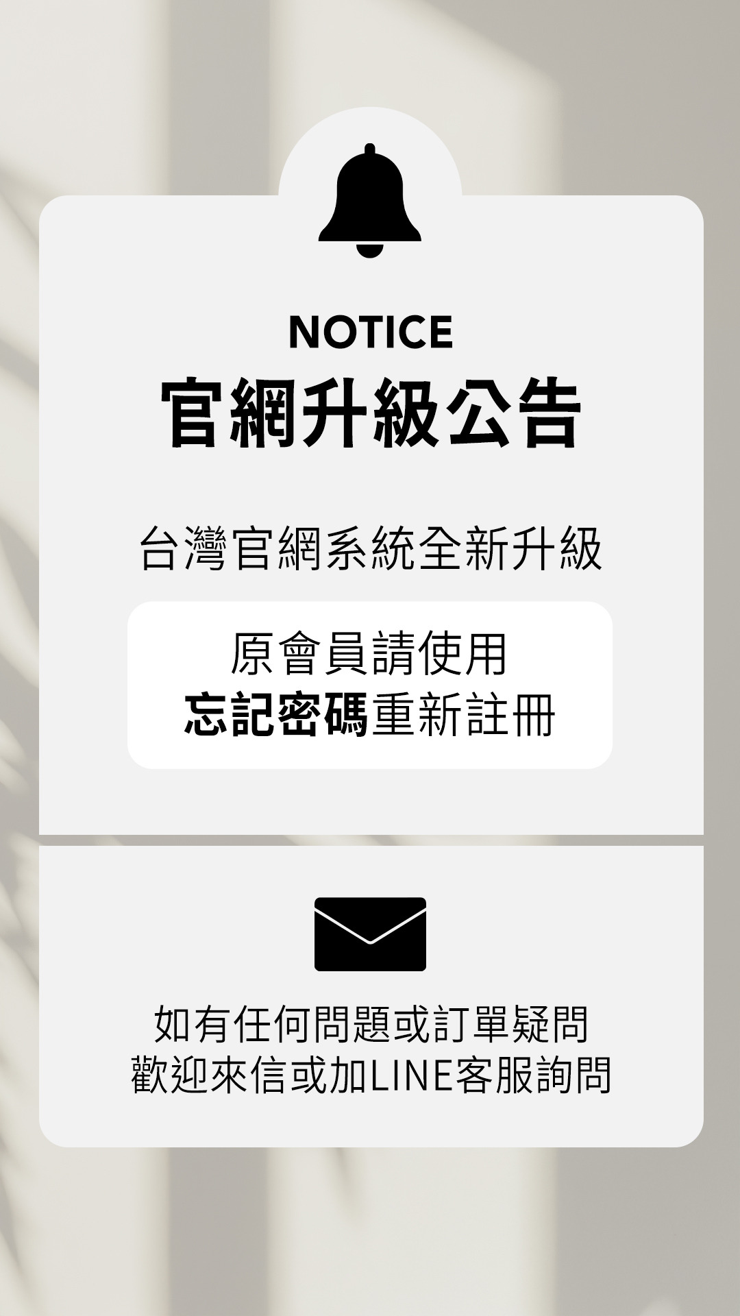 台灣官網系統全新升級 原會員請使用忘記密碼重新註冊後登入