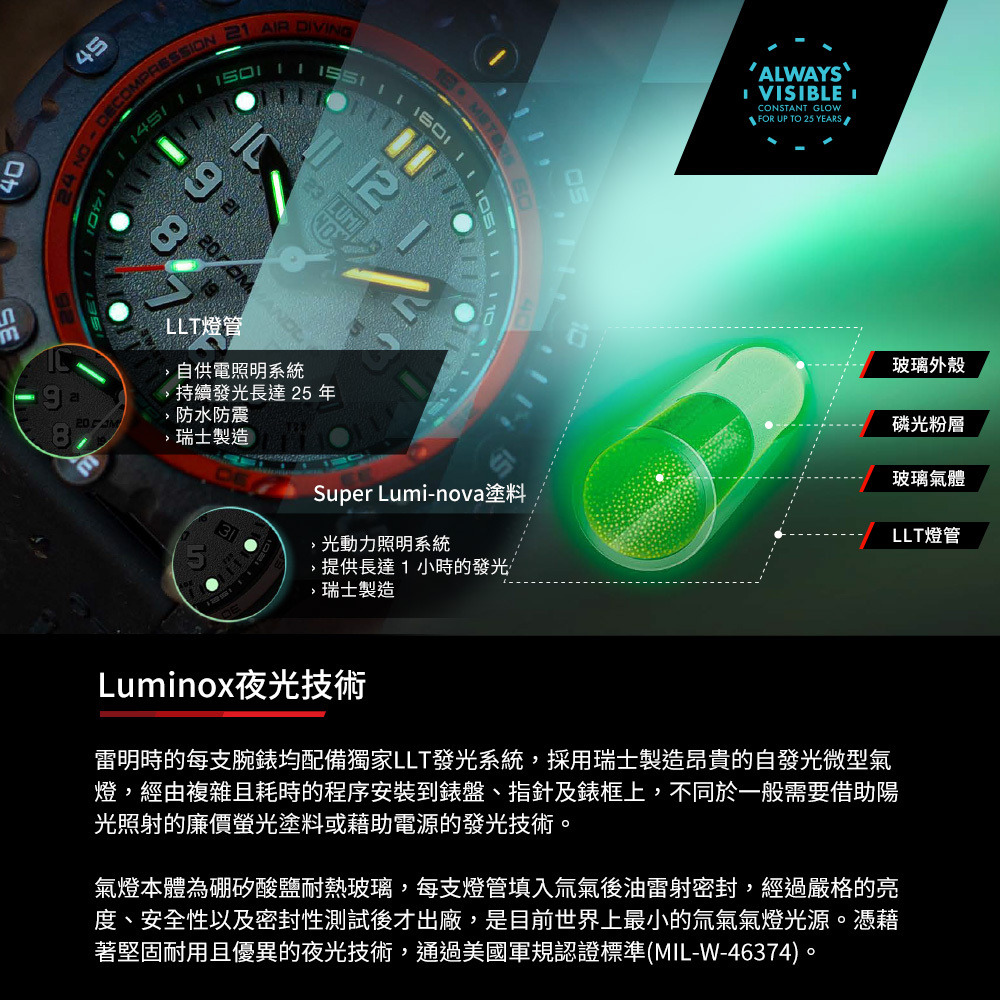 搭載 Luminox 獨家專利 LLT 自體發光技術: